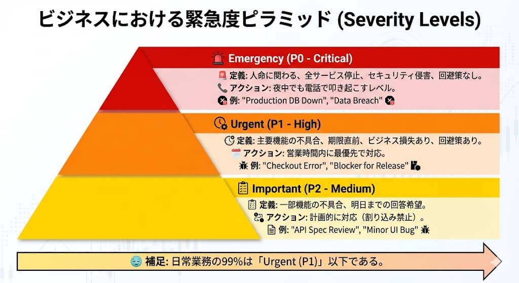 日常的なバグ修正や、明日のリリースに向けた確認作業は、どれほど急いでいてもUrgent(P1)の範疇に留まります。